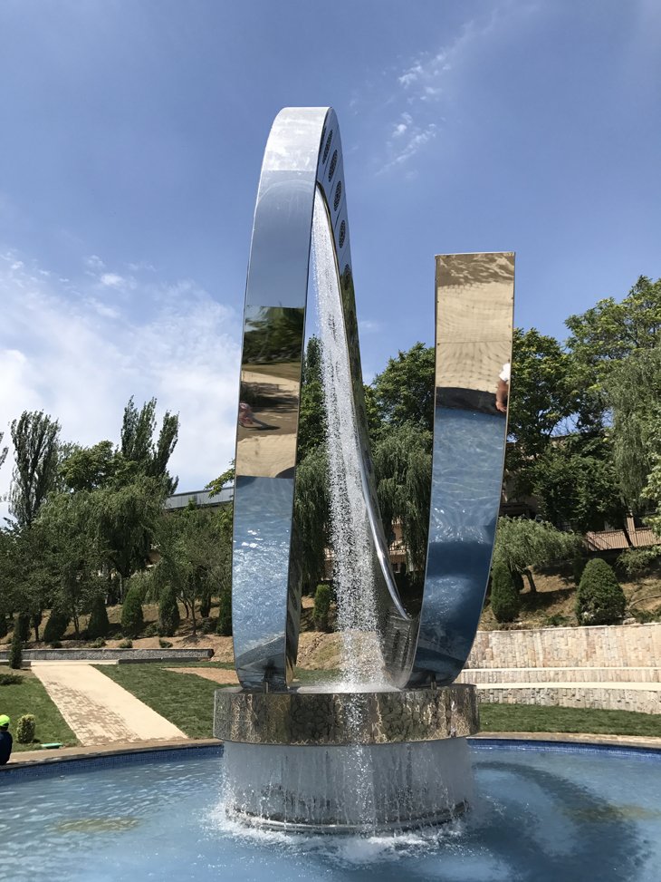 У второго входа в парк, а их здесь два (и в обоих случаях предусмотрены парковки, которые также были сегодня закрыты) — запустили фонтан, который был полностью реконструирован. Он действительно вышел необычным и привлек немало людей к себе. Большая часть селфи сегодня были сделаны именно здесь.