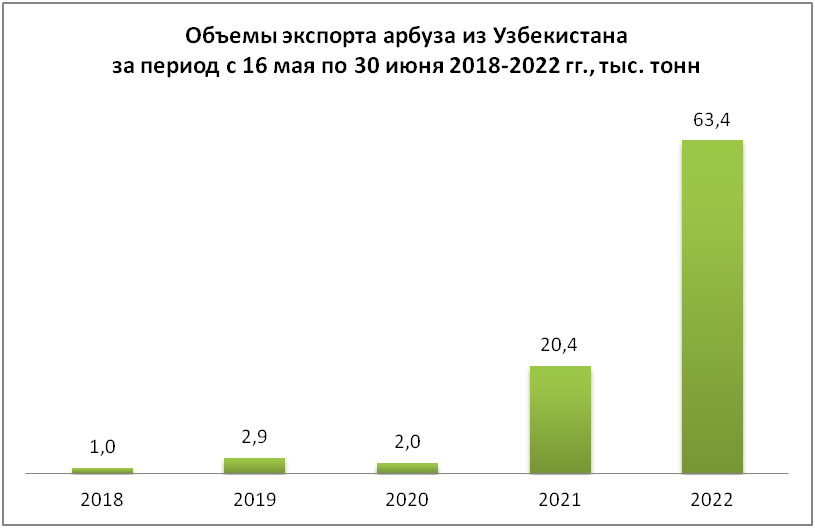 По предварительным данным Таможенного комитета республики, в период с 16 мая по 30 июня 2022 года Узбекистан экспортировал 63,4 тысячи тонн арбуза, что в 3,1 раза больше, чем в аналогичном периоде 2021 года. Если учесть, что в этом же периоде в 2018-2020 годах экспорт арбуза из Узбекистана в натуральном выражении не превышал 3 тысячи тонн, то объем экспорта за полтора месяца с начала нынешнего сезона превысил показатели 2018-2020 года более чем в 20 раз.