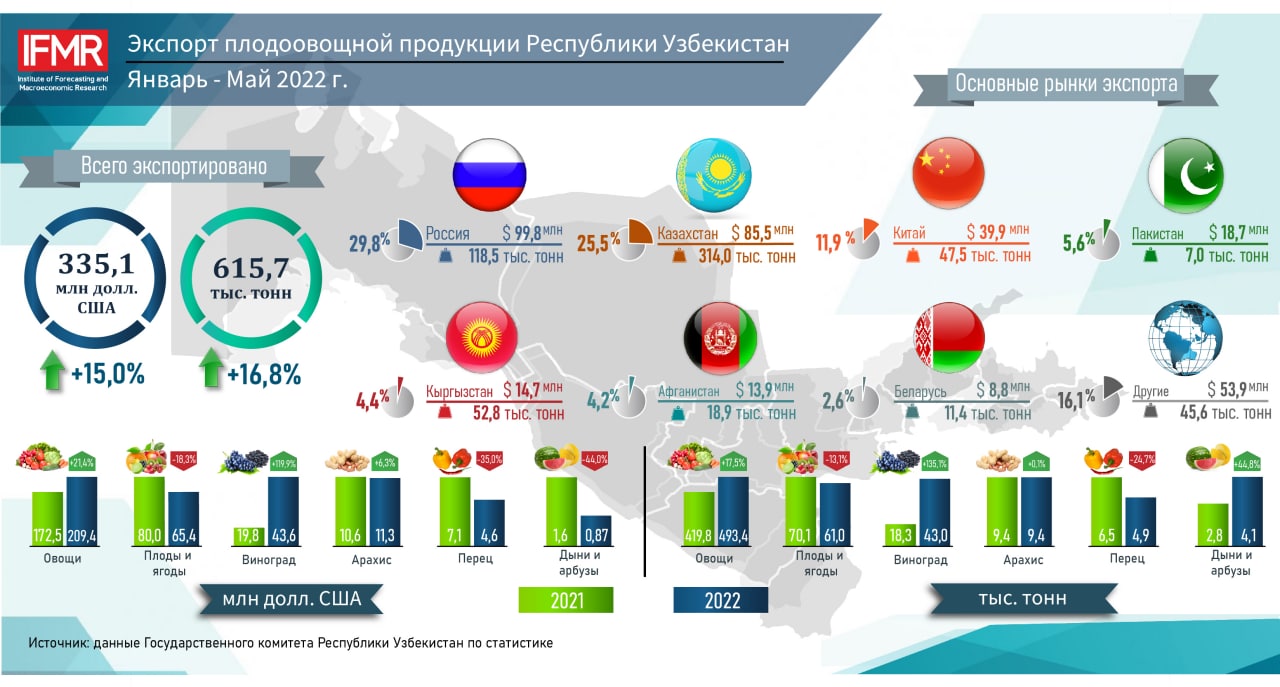 Основные рынки экспорта плодоовощной продукции пришлись на Россию (29,8%, 99,8 миллиона долларов), Казахстан (25,5%, 85,5 миллиона долларов), Китай (11,9%, 39,9 миллиона долларов), Пакистан (5,6%, 18,7 миллиона долларов), Кыргызстан (4,4%, 14,7 миллиона долларов), Афганистан (4,2%, 13,9 миллиона долларов) и Беларусь (2,6%, 8,8 миллиона долларов).