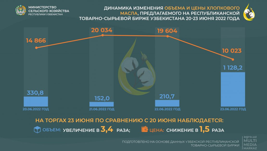 Цена на хлопковое масло резко упала 23 июня. В частности, стоимость тонны хлопкового масла снизилась с 14,8 тысячи сумов (20 июня) до 10 тысяч сумов (23 июня), что означает снижение в 1,5 раза.