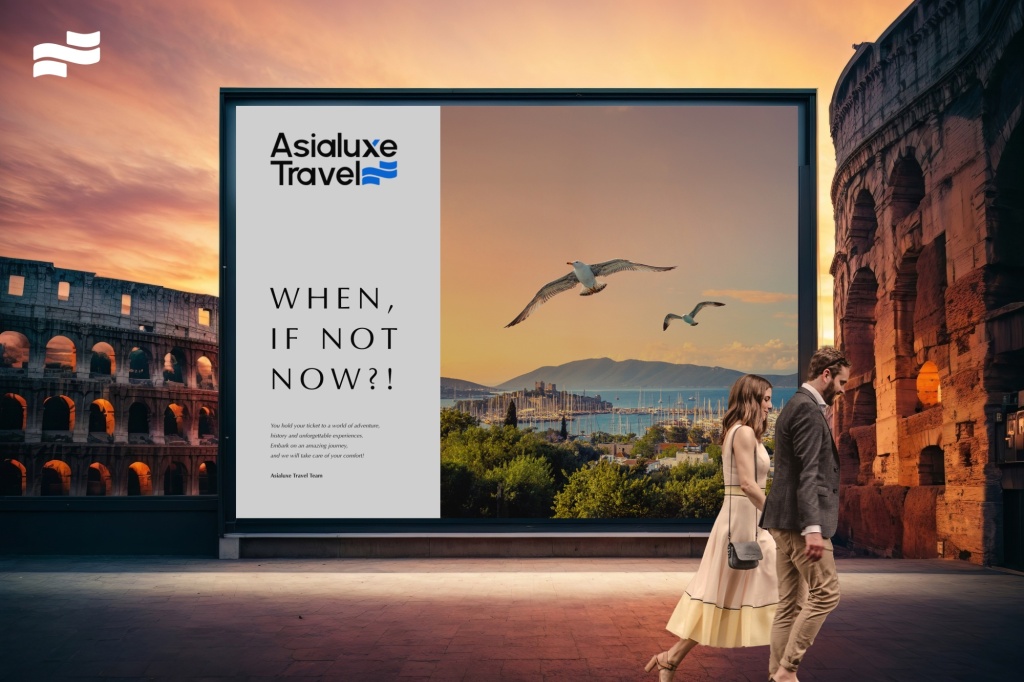 Горизонт между небосводом и водой: эти же линии можно воспринимать как горизонт, разделяющий небо и воду. Образ символизирует бесконечные возможности и новые горизонты, которые открываются перед клиентами Asialuxe Travel. Горизонт вызывает чувства свободы и открытий, подчеркивая стремление компании предлагать не просто путешествия, а эмоциональные и расширяющие кругозор приключения.