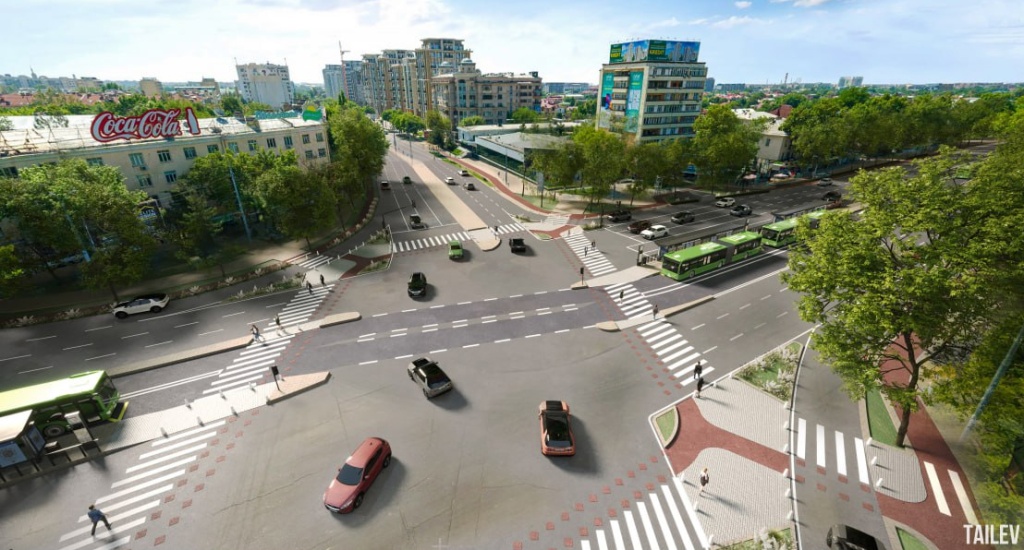 Все пешеходные переходы будут оборудованы светофорами. Кроме того, вдоль улицы станет больше зеленых зон и насаждений.