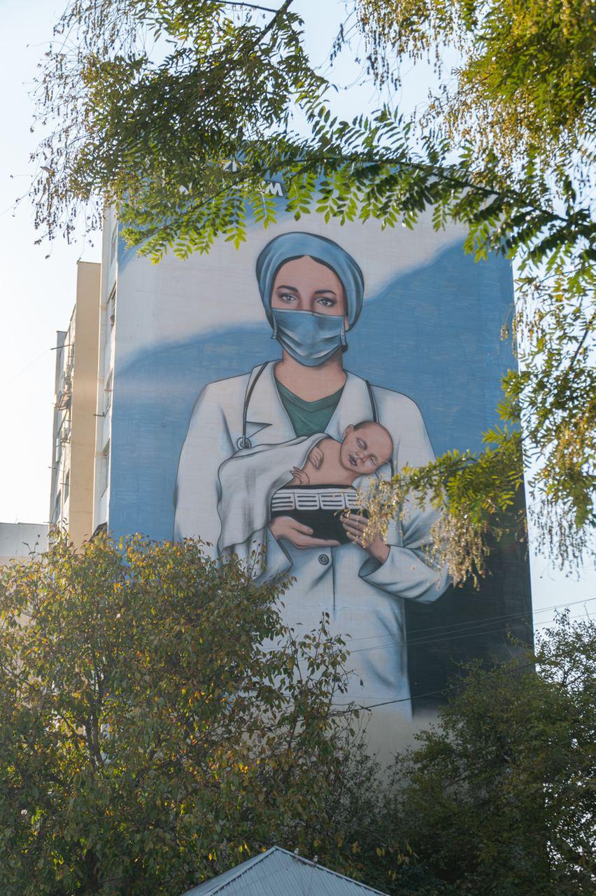 Для создания мурала власти города предоставили площадь и транспорт. В итоге за всего за несколько дней на стене многоэтажного дома появилась девушка-врач, оберегающая младенца от главного недуга двадцать первого века.