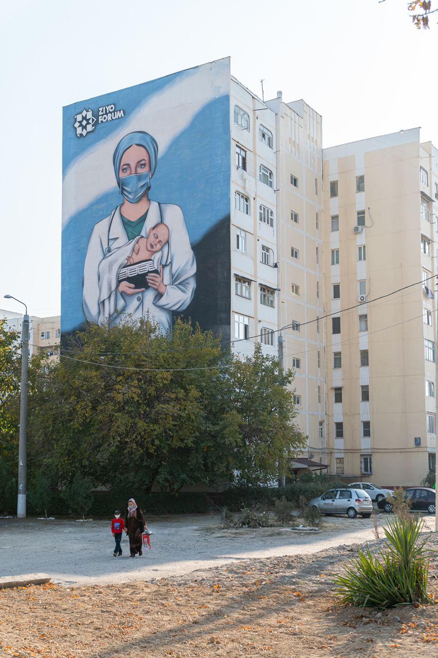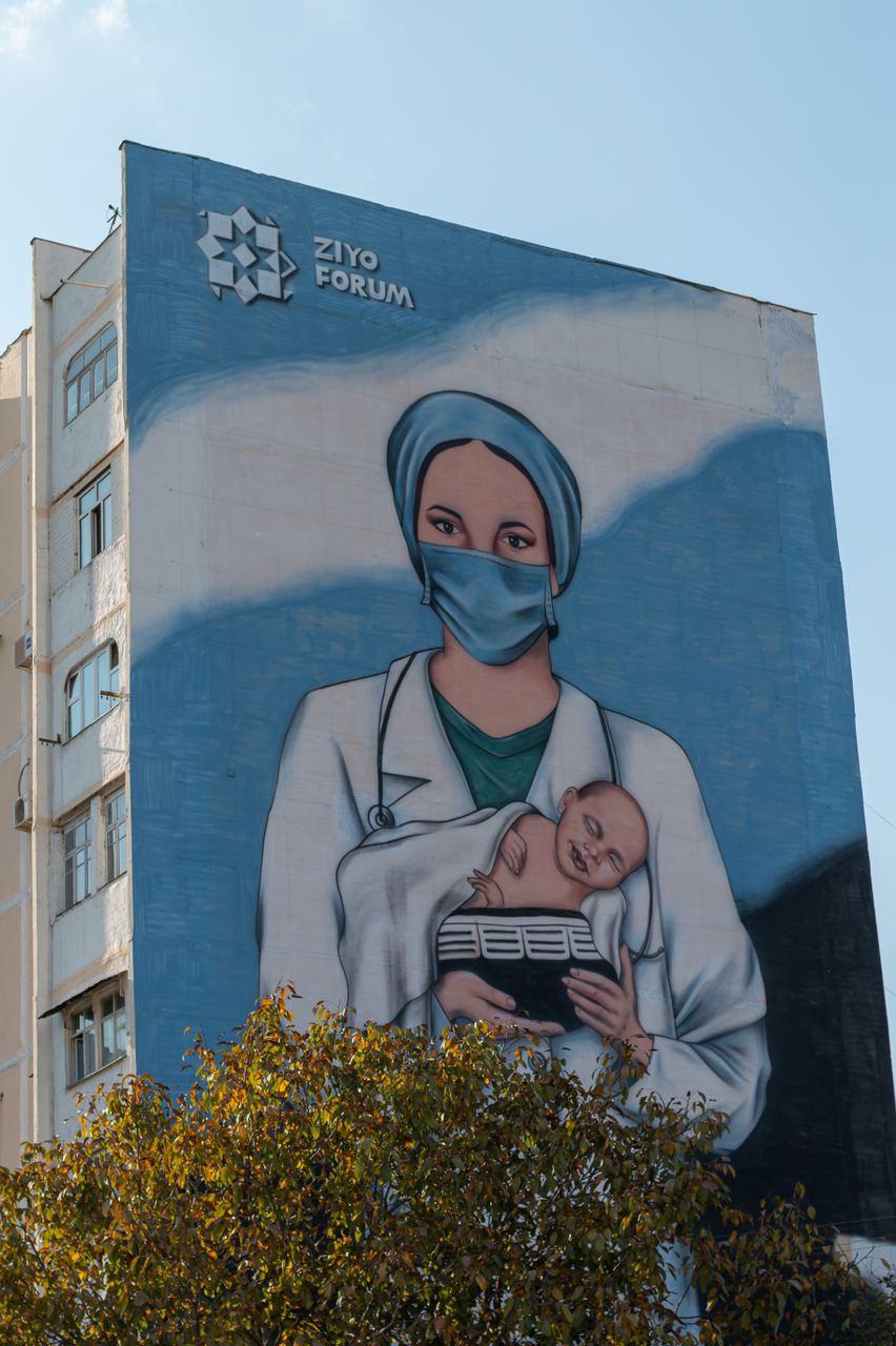 Узбекистан, Ташкент – АН Podrobno.uz. В Сергелийском районе завершилось создание первого мурала в честь героев нашего времени – врачей, борющихся против коронавируса. Произведение появилось на пересечении улиц Янги Сергели и Лутфкор, сообщает корреспондент Podrobno.uz.