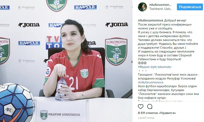 У Нилуфар, кстати, большая сила воли, а еще хорошее чувство юмора. Ее недавний пост, который мы надеемся был апрельской шуткой, вызвал огромный шквал сообщений от поклонников. На днях певица заявила: «После закрытой пресс- конференции можно уже и сообщать. Я ухожу с шоу-бизнеса. Я поняла, что меня с детства интересовал футбол. Человек должен заниматься тем, что душа требует. Надеюсь вы меня поймете и поддержите!».