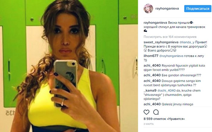 Райхон Ганиева тоже посещает спортзал. В начале весны певица выложила мотивирующий пост для поклонников: "Приход весны - хороший стимул для начала тренировок". Она всегда в прекрасной форме, и любящая гвардия поклонниц всегда прислушивается к советам Райхон, которыми она охотно делиться. Так держать, Райхон! Вас любят за вашу искренность и красоту души и тела.