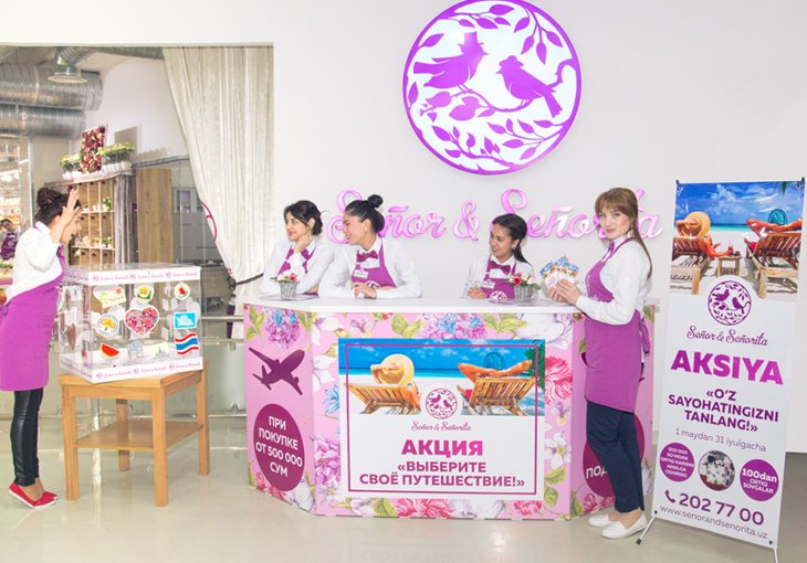 С 1 мая по 31 июля 2016 года вы можете принять участие в акции «Выберите свое путешествие!» и выиграть 5 путешествий на двоих на выбор в Таиланд или Малайзию, или Турцию, а также более 100 роскошных подарков от магазина Señor & Señorita. Для участия в акции необходимо всего лишь сделать покупку на сумму от 500.000 сум.