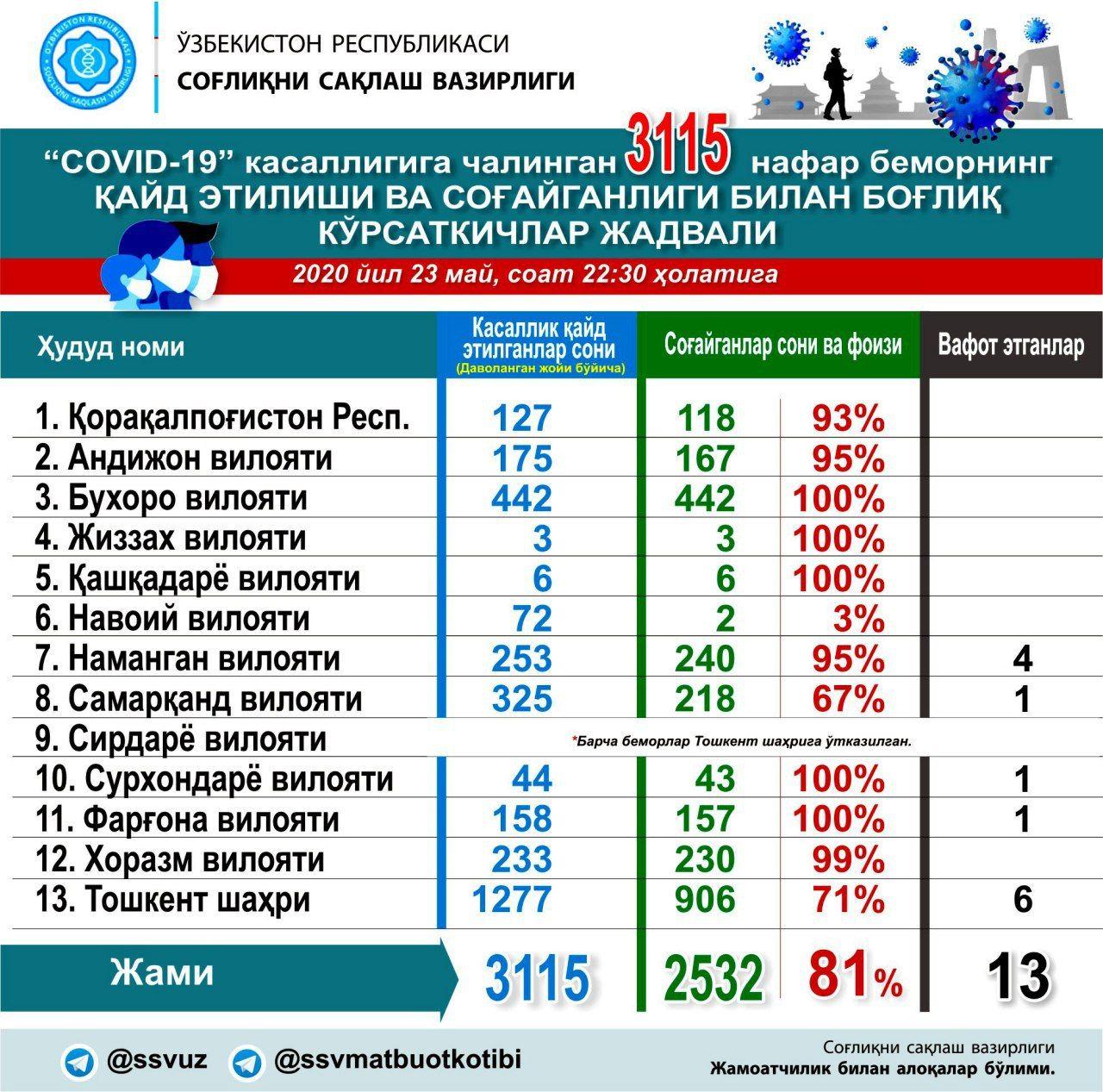 За сутки, с 22 по 23 мая, в Ташкенте появилось 72 новых больных с COVID-19, а Самаркандской области – 7. При этом 70 выявленных случаев – это прилетевшие из-за рубежа, а 9 – инфицированные внутри страны.
