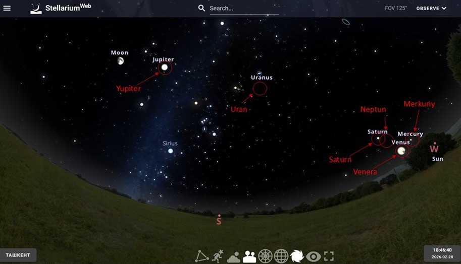 Узбекистан, Ташкент – АН Podrobno.uz. Завтра, 28 февраля, жители Узбекистана смогут наблюдать уникальное астрономическое явление — парад шести планет, которые выстроятся в юго-западной части неба и займут четверть небесной сферы. Подобные большие парады происходят примерно раз в 20 лет.