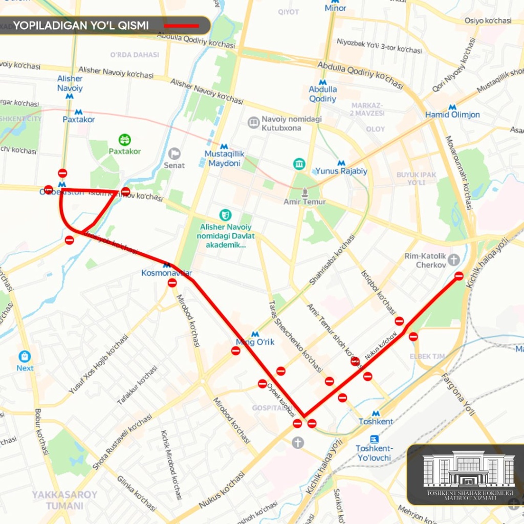 - улица Афросиаб – от пересечения с проспектом Ислама Каримова до пересечения с улицей Бешагач