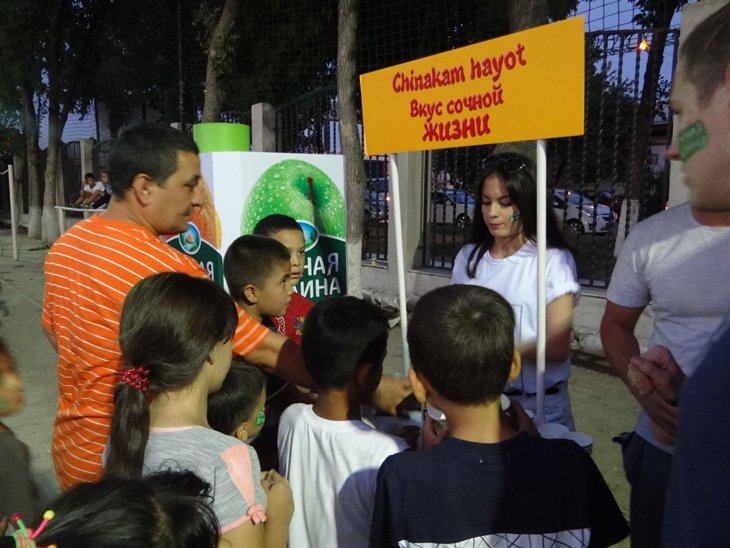 Над трибунами развевались флаги с логотипом компании InterSok, разноцветные плакаты привлекали внимание веселыми слоганами. Большие барабаны, труба, тарелки, дудки – «сочная» команда поддержки обзавелась целым музыкальным «арсеналом», который не замедлила пустить в ход. Веселый шум, наполнивший трибуны, послужил своеобразной рекламной кампанией для турнира: к болельщикам присоединились жители соседних махаллей, обычные прохожие. Особенно радовалась футбольному празднику детвора: с удовольствием подставляла мордашки художнику по аквагриму, рисовавшему всем желающим логотип «Сочная долина», подпевала веселой музыке, дегустировала соки. В тот день гости и участники матча могли насладиться новыми вкусами «Сочной долины» (кокос-ананас) и Viko (манго-апельсин и пина колада). Специально приглашенный ди-джей радовал поклонников футбола современными хитами и заводными треками.