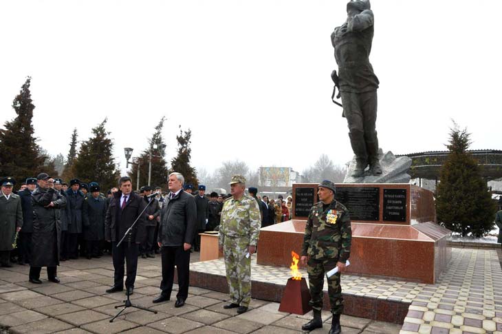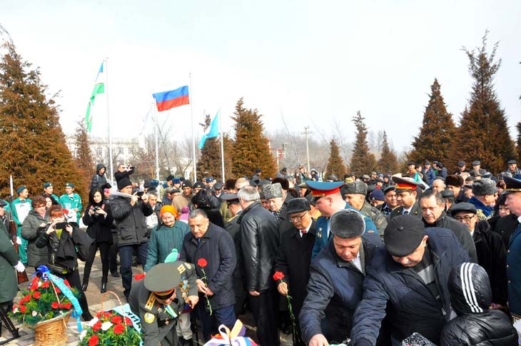 При открытии памятника под гимны России и Узбекистана были подняты государственные флаги двух стран. Присутствующие почтили память павших в Афганистане минутой молчания.