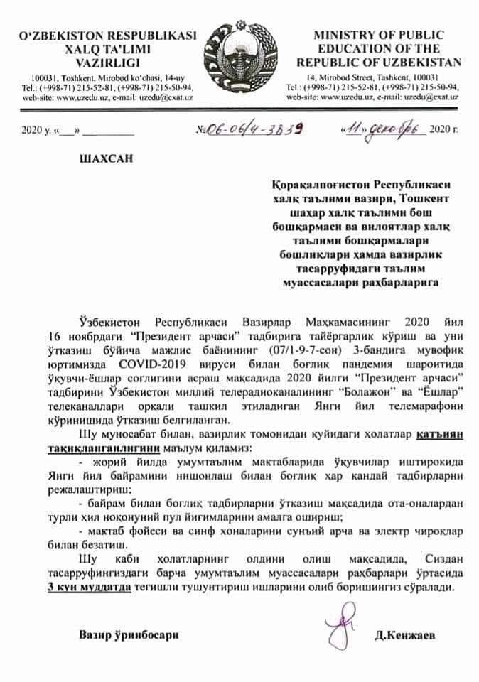 Об этом говорится в письме от 11 декабря, подписанном заместителем министра народного образования Дильшодом Кенжаевым.