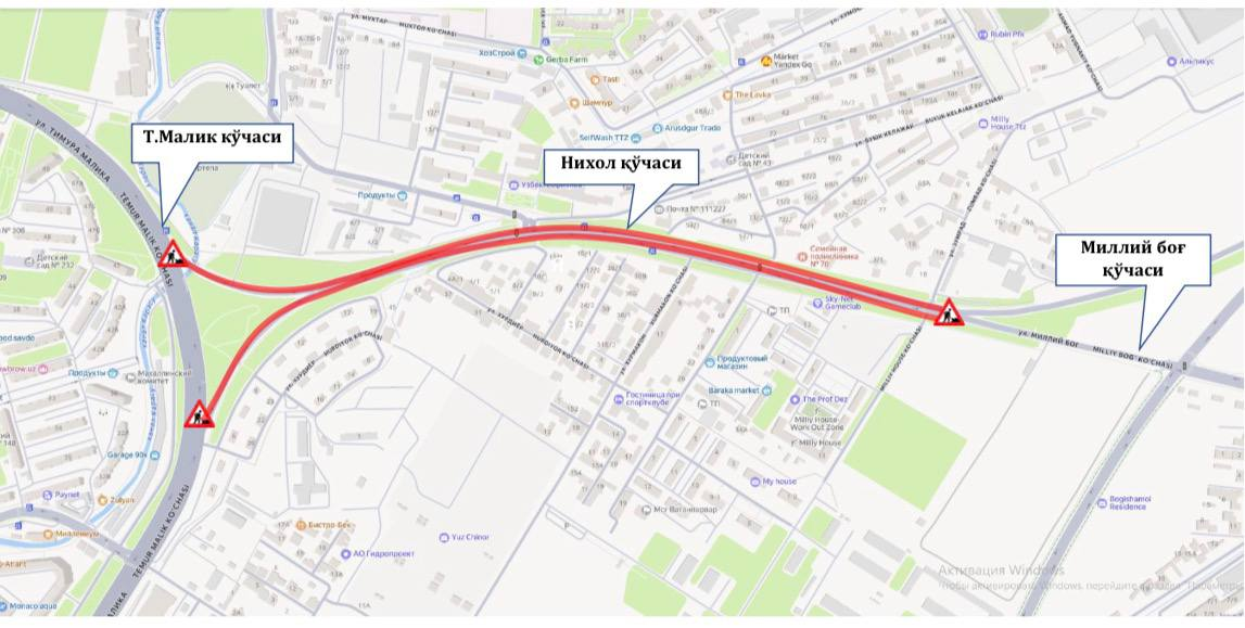 По данным хокимията района, из-за дорожно-ремонтных работ на улице Нихол движение временно закрыто для транспорта – на участке от улицы Миллий Бог до улицы Темура Малика.