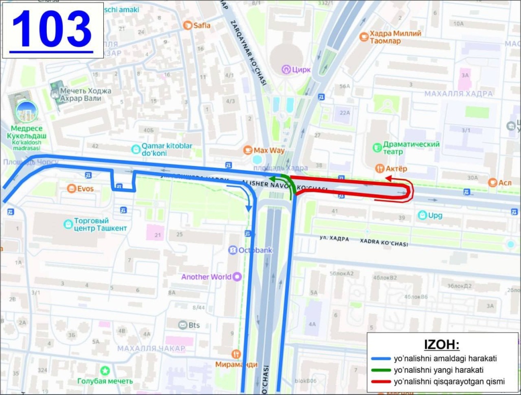 Кроме того, скорректированы схемы движения маршрутов №141 (в районе метро "Пахтакор") и №103, который больше не будет курсировать до остановки Национального драматического театра через улицу Алишера Навои.