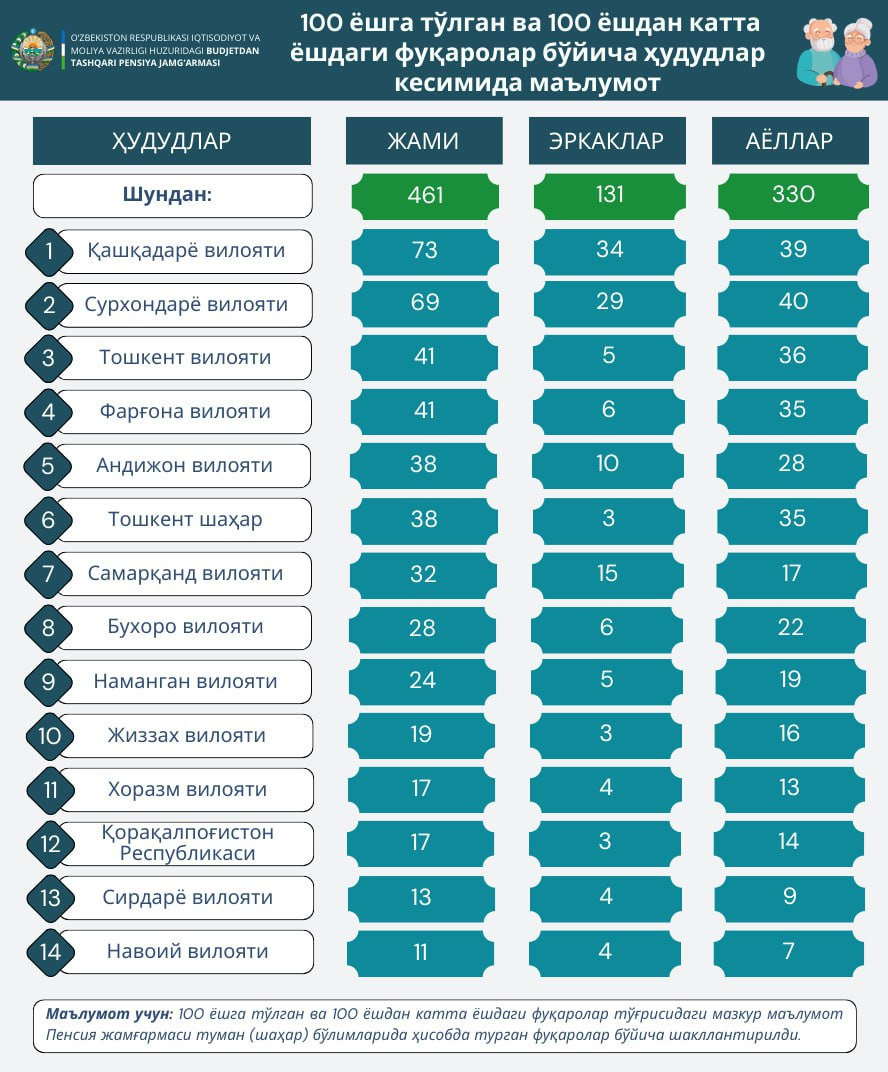 География долгожителей распределена неравномерно. Больше всего людей старше 100 лет проживает в южных регионах страны. Лидером по числу вековых пенсионеров стала Кашкадарьинская область, где таких жителей 73. Немного уступает ей Сурхандарьинская область – 69 человек. В Ташкентской области столетний рубеж преодолел 41 пенсионер.