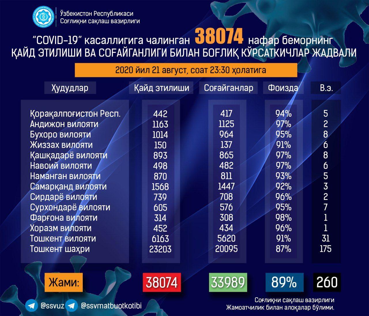 Узбекистан, Ташкент – АН Podrobno.uz. В Узбекистане за сутки, с 20 по 21 августа, был выявлен 381 больной коронавирусом. По состоянию на 21 августа на 23:30 число случаев заражения коронавирусной инфекцией достигло 38074, сообщает корреспондент Podrobno.uz со ссылкой на Минздрав.