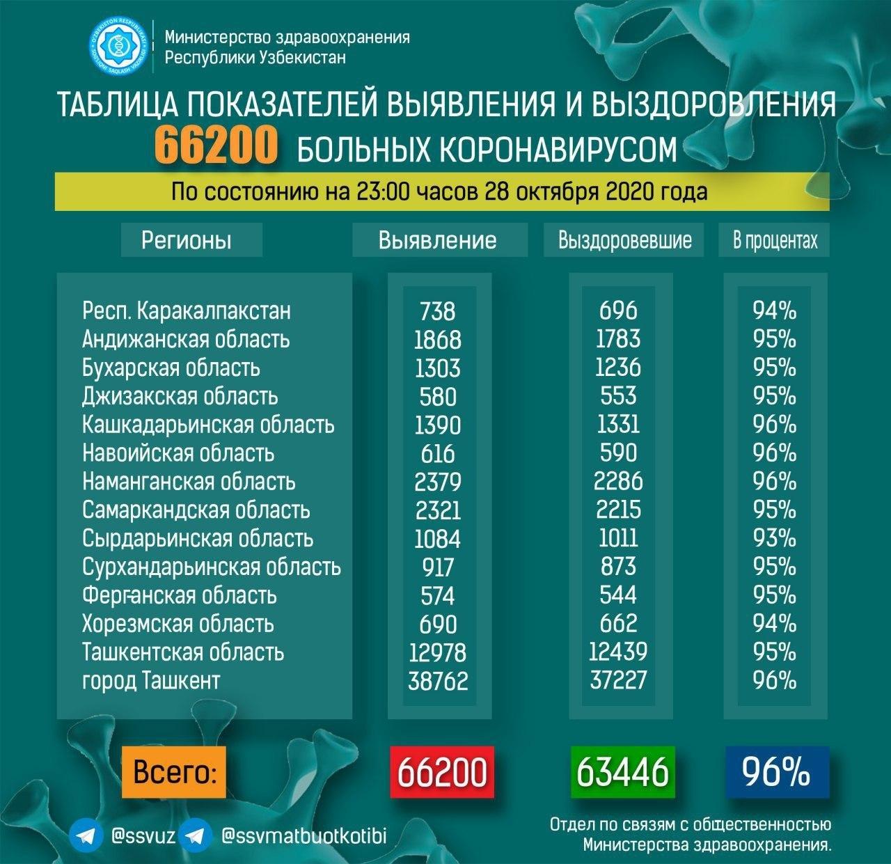 Узбекистан, Ташкент – АН Podrobno.uz. В Узбекистане за сутки, с 27 по 28 октября, было выявлено 256 больных коронавирусом (сутками ранее 277). По состоянию на 28 октября на 23:30 число случаев заражения коронавирусной инфекцией достигло 66200, сообщает корреспондент Podrobno.uz со ссылкой на Минздрав.