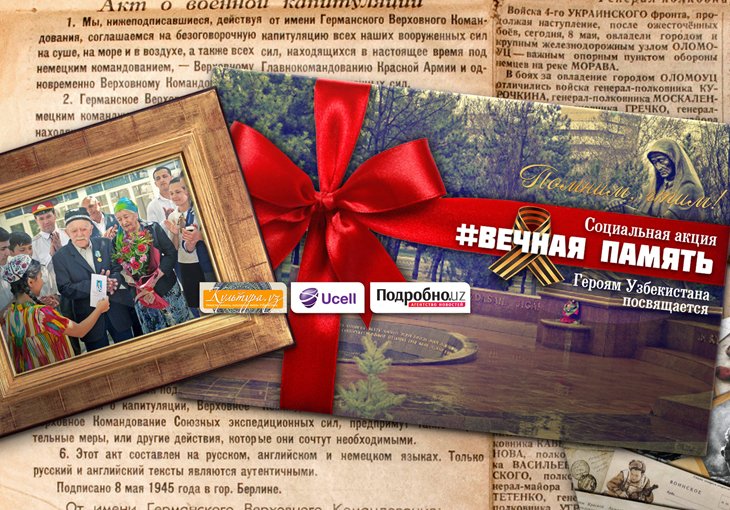Узбекистан, Ташкент - АН Podrobno.uz. Сегодня, 29 апреля, стартует уникальная акция #ВечнаяПамять, посвященная 9 мая – Дню памяти и почестей, дню Великой Победы над фашизмом. Сотни тысяч узбекистанцев отдали свои жизни за наше мирное небо. Наш долг – всегда помнить это и чтить своих героев.