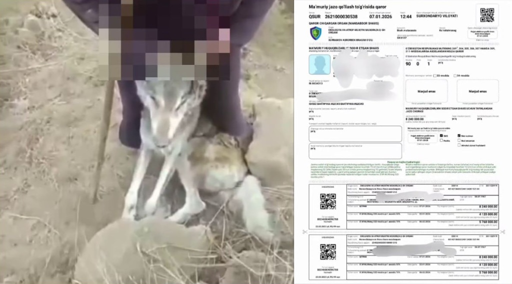 Экологи квалифицировали произошедшее как нарушение требований статьи 33 закона "О защите и использовании животного мира". На основании акта гражданина привлекли к ответственности по части 1 статьи 90 Кодекса об административной ответственности. Ему назначили штраф в размере 8,2 миллиона сумов.